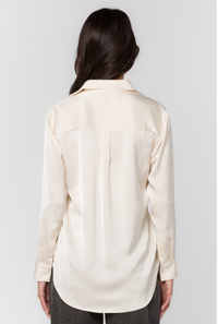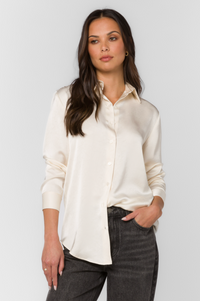 Glam up your button down shirt collection with the Adelynn in a rich cream color. Smooth satin-like fabric with button cuffs have you runway ready!