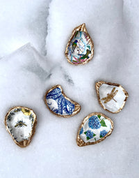 Each recycled oyster shell is hand painted, decoupaged, and finished with a painted gold leaf trim. The backs are left natural to maintain the oyster’s natural beauty. The shells measure approximately 3-4+ inches in length. As these shells were created by nature, they will vary in shape and size. No two are alike! There will be slight variations in print with each oyster. Handmade with care in coastal Maine.