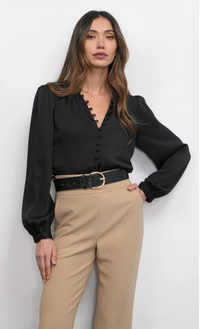 Crafted from a luxurious, fluid fabric that drapes beautifully, fabric-covered buttons, adding a refined detail. Its elegant long sleeves are subtly gathered at the shoulders and finish with comfortable elasticated cuffs, creating a gentle puff effect.