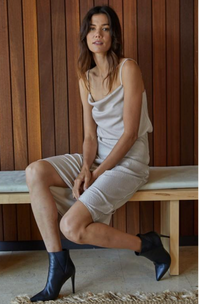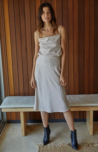 You'll be the thirst trap in our Champange colored Satin Cami! Delicate scoop cowl neck and adjustable straps.