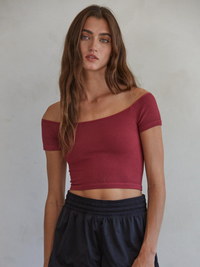 This essential modal off shoulder top is a micro rib stretch fabrication. Fitted and cropped design.