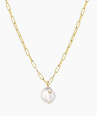 This gold chain necklace features an organic pearl pendant. We love wearing this pearl necklace layered with other gold chain necklaces.