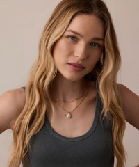 Model is wearing the Reese Pearl Necklace, Reese Pearl Charm Necklace and Reese Pearl Huggies.