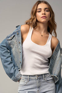 Looking for the perfect basic denim jacket? This timeless classic is it. She has just the right amount of stretch, a unique raw hem, and the perfect mid-color wash with all the solid grommets and seams to make it look much higher-end than the price tag.
