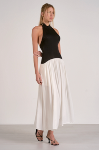 You'll halt traffic in this stunning halter dress from Elan. A mixed media with a stretchy knit halter top and full cotton skirt. Drop waist with pockets!