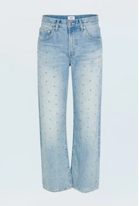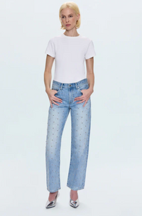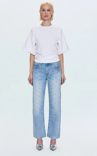 The best-selling jean that understands proportions. Lexi sits at the perfect mid-rise with our signature bowed straight leg, and a subtle curve at the knee that creates dimension without effort. Finished with a 29" inseam, the silhouette tapers to a cropped ankle with a clean hem. Crafted from our rigid denim in Aries, a light blue wash adorned with subtle stud details that feel refined and intentional, never overdone. Your must-have statement jean for making an impact with sophisticated appeal.