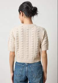 This cable knit short sleeve cardigan sweater is a head turner. With its shorter length and smaller proportions, this merino wool and cashmere blend sweater is perfect for pairing with skirts or high-waisted pants and feels amazing. The cable knit texture brings dimension, making it the perfect piece whether layered under a blazer or worn on its own. Buttons are fabric covered and large size for added detail.