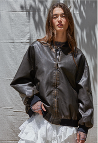 Get Top Gun ready in this Vegan Leather bomber. A Woven Polyurethane Cotton, Faux Leather Zip Up with a Ribbed Collar.