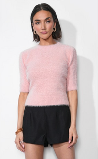 Featured in a clean, bright Ivory color, this top is defined by its fuzzy knit texture, which adds a luxurious and cozy element. The silhouette features elbow-length sleeves, offering a modern, slightly cropped sleeve look that is versatile for layering or standalone wear.