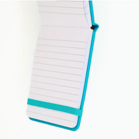 The cover is made of a soft leatherette material and the print is embossed. Half the pages are lined and half are unlined. It has an elastic band attached to keep the notebook closed. The perfect pad to keep all your notes and ideas jotted down.