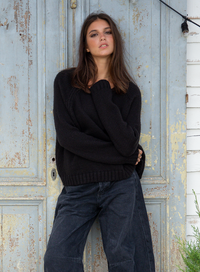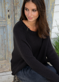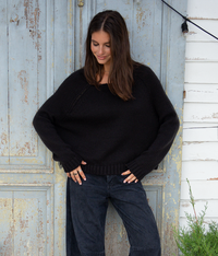 Buttery soft and midweight, this boxy yet flattering crew comes in a true black colorway. The dropped shoulder creates extra slouch, while the slightly cropped body keeps the fit super flattering. The functional zipper detail runs diagonally from the crew neckline towards armpit.